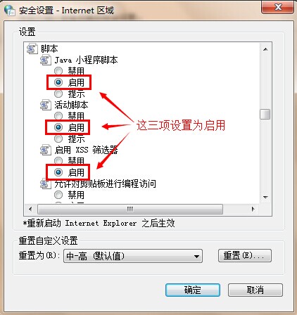 3、如下图,移动到Java小程序脚本,并按图中提示将前三项设置为“启用”,然后点击“确定”返回到“Internet选项”,再次点击“确定”。保存完设置,重新打开浏览器即可正常操作。