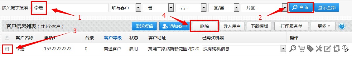 第一步:在“关键字搜索”输入框输入您要删除的客户名称、电话或者地址信息,然后点击后面的“查询”按钮: