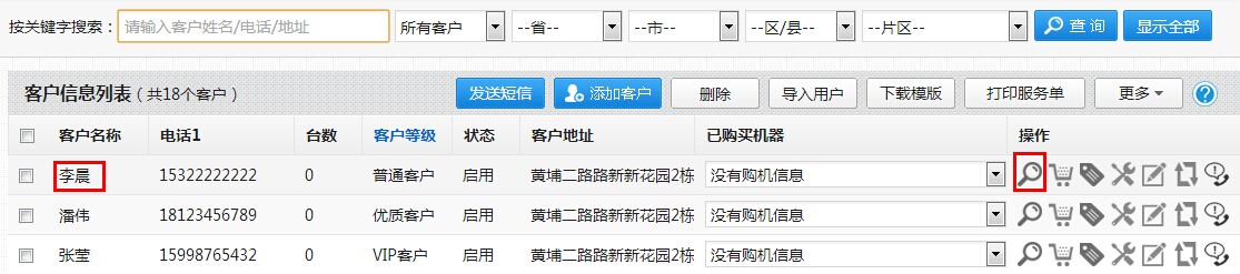 第一步:找到要修改的客户资料,点击“操作”栏的放大镜——“查看详情”按钮,比如按下图查看修改李晨的客户资料: